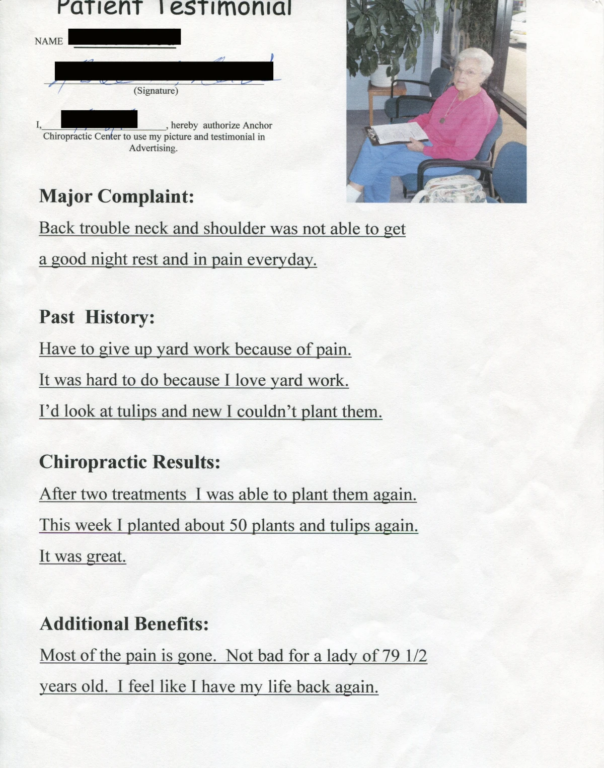 Back trouble, neck and shoulder pain, was not able to get a good night rest, and in pain every day. Having to give up yard work because of pain, it was hard to do because I love yard work. I’d look at the tulips and I knew I couldn’t plant them. After two treatments, I was able to plant them again. This week, I planted about 50 plants and tulips again. It was great. Most of the pain is gone, not bad for a lady 79 1/2 years old. I feel like I have my life back again.